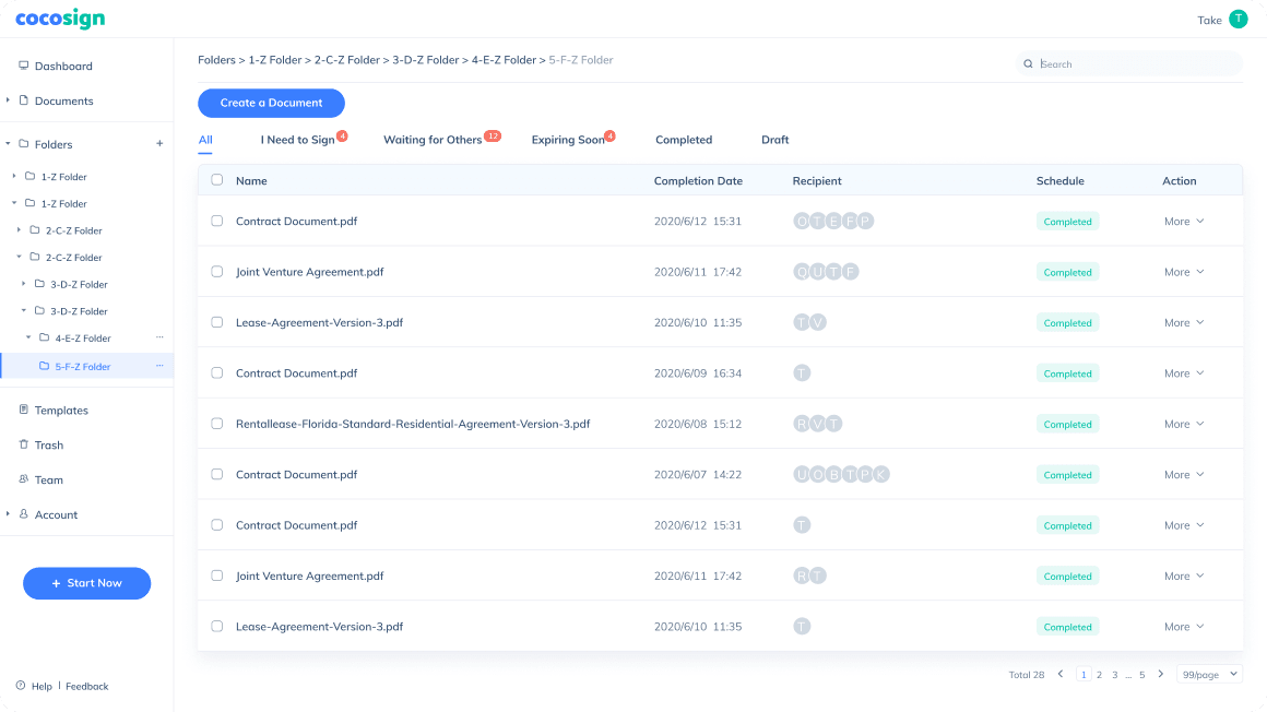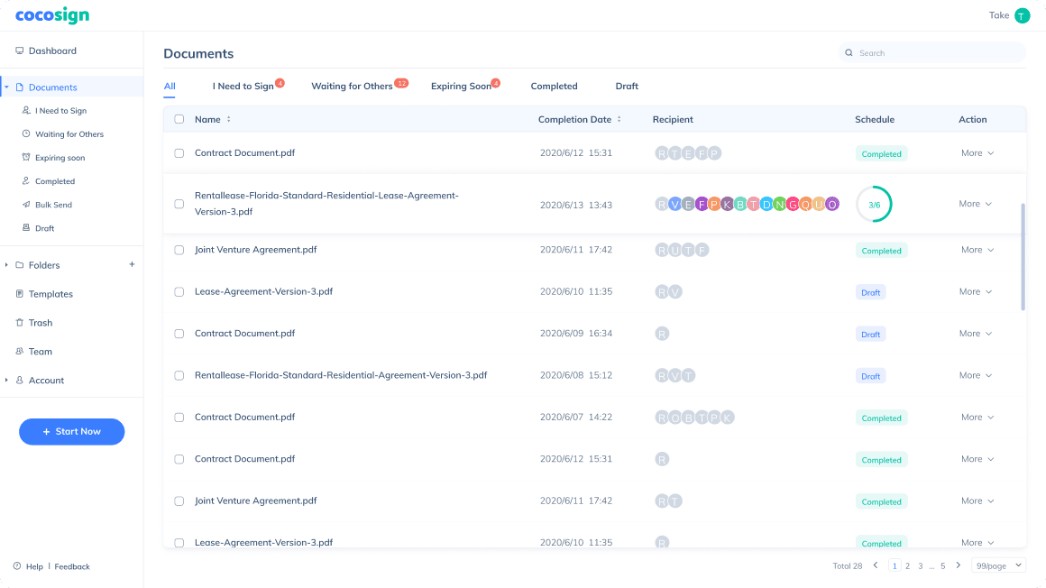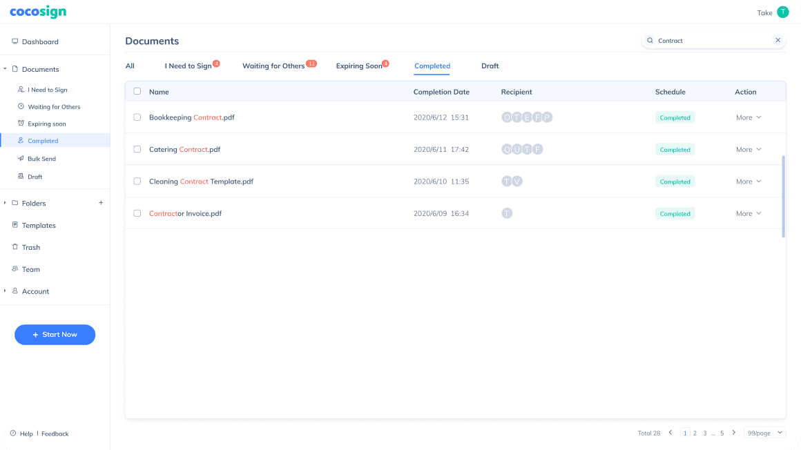CocoSign archives and categorizes files entailing your or others’ signatures, whether drafted, completed, or expiring soon respectively.