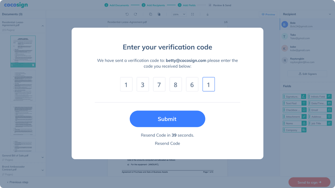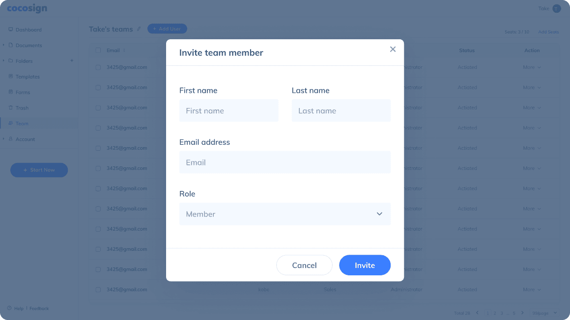 Add new team members to grant them instant access to your CocoSign account.