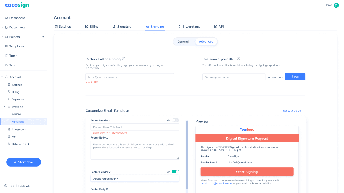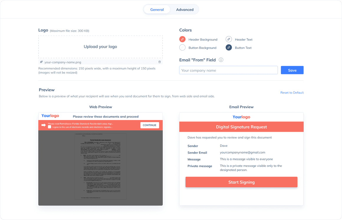 Stay in control of the logo, color, url, and the email template of the signing invites.