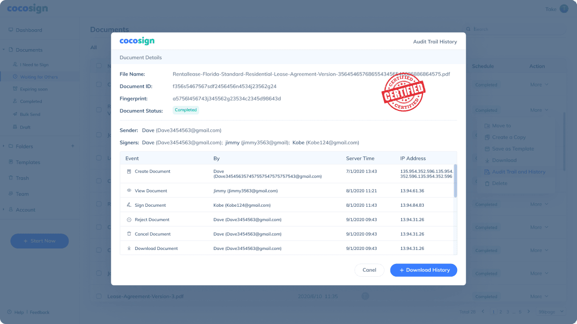 Get a detailed history recording all signing activities of a document along with a timestamp, which can serve as admissible evidence in court.